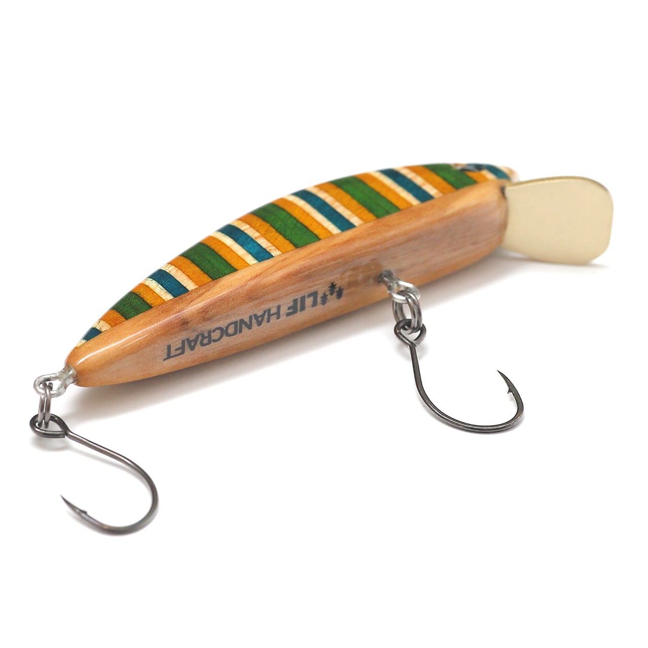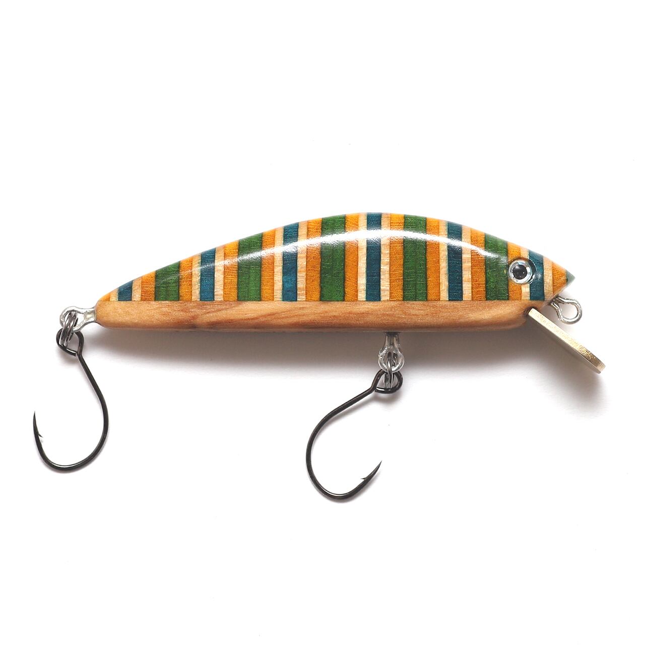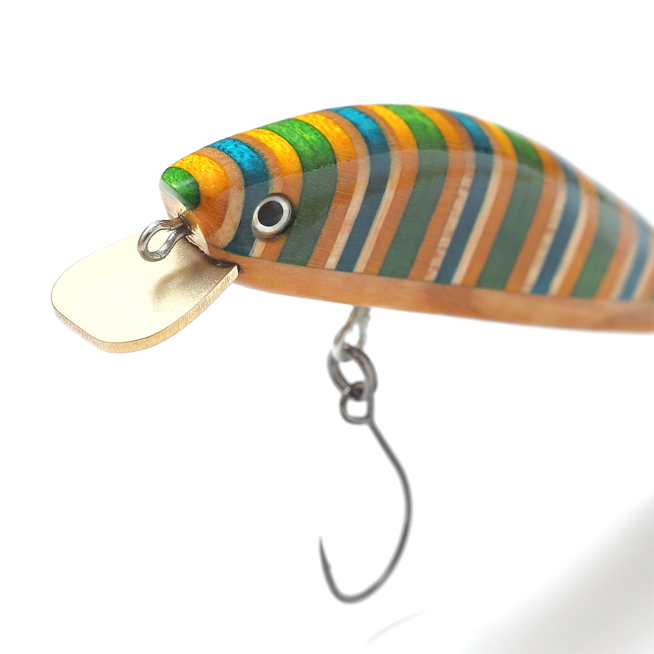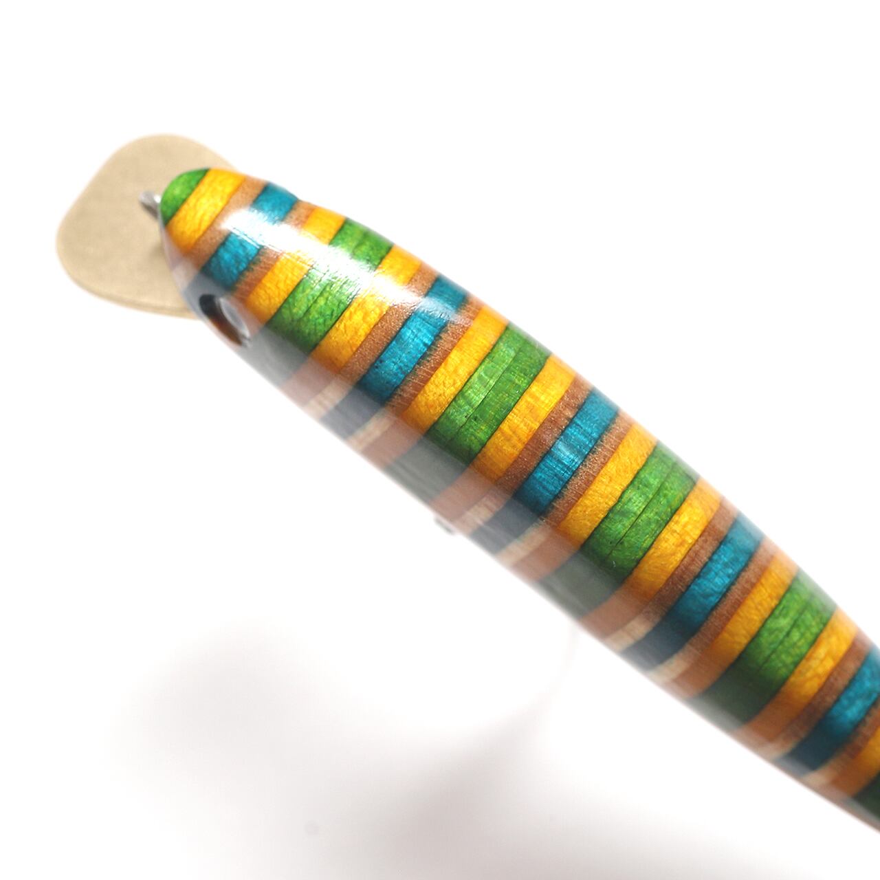 スケートボードのプライの色合いを活かした縞々模様と、ベリー部分にオリーブウッドを組み合わせ、5PLY 54Sと同じシェイプに仕上げた54mmのミノーです。