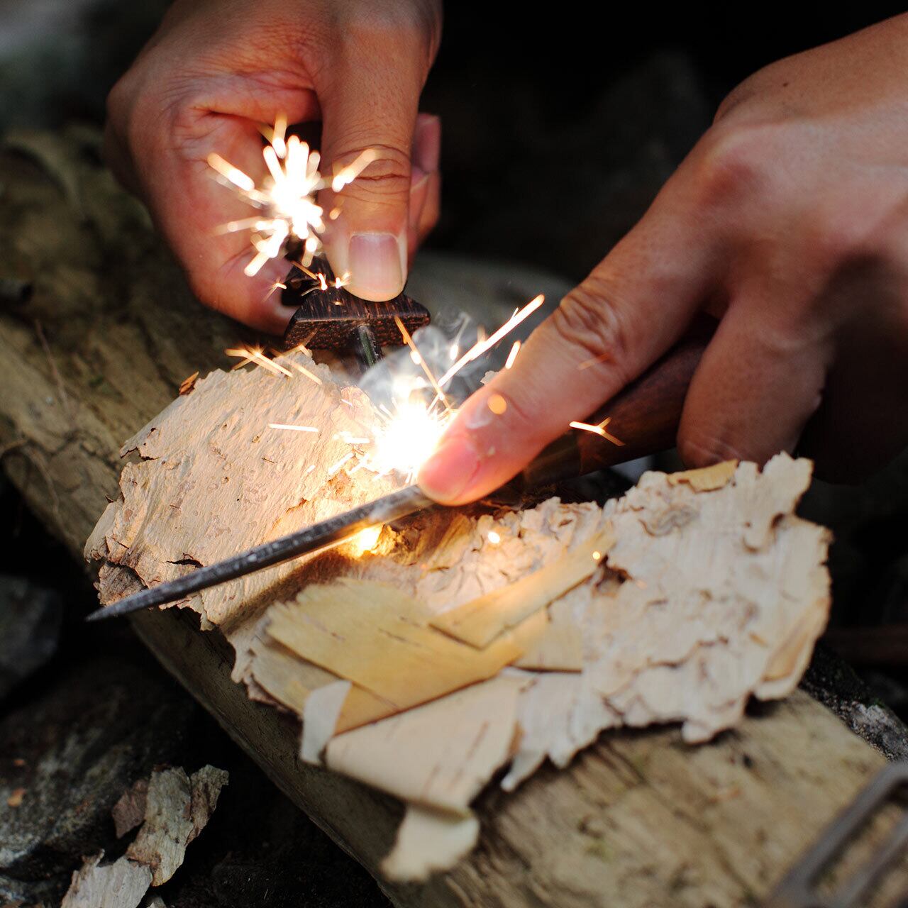 焚き火に使う際は、燃えやすく細かい繊維や白樺の樹皮、ティッシュペーパーなどへ本品から火花を飛ばして着火し、細い小枝や着火剤に燃え移らせて火を育ててください。